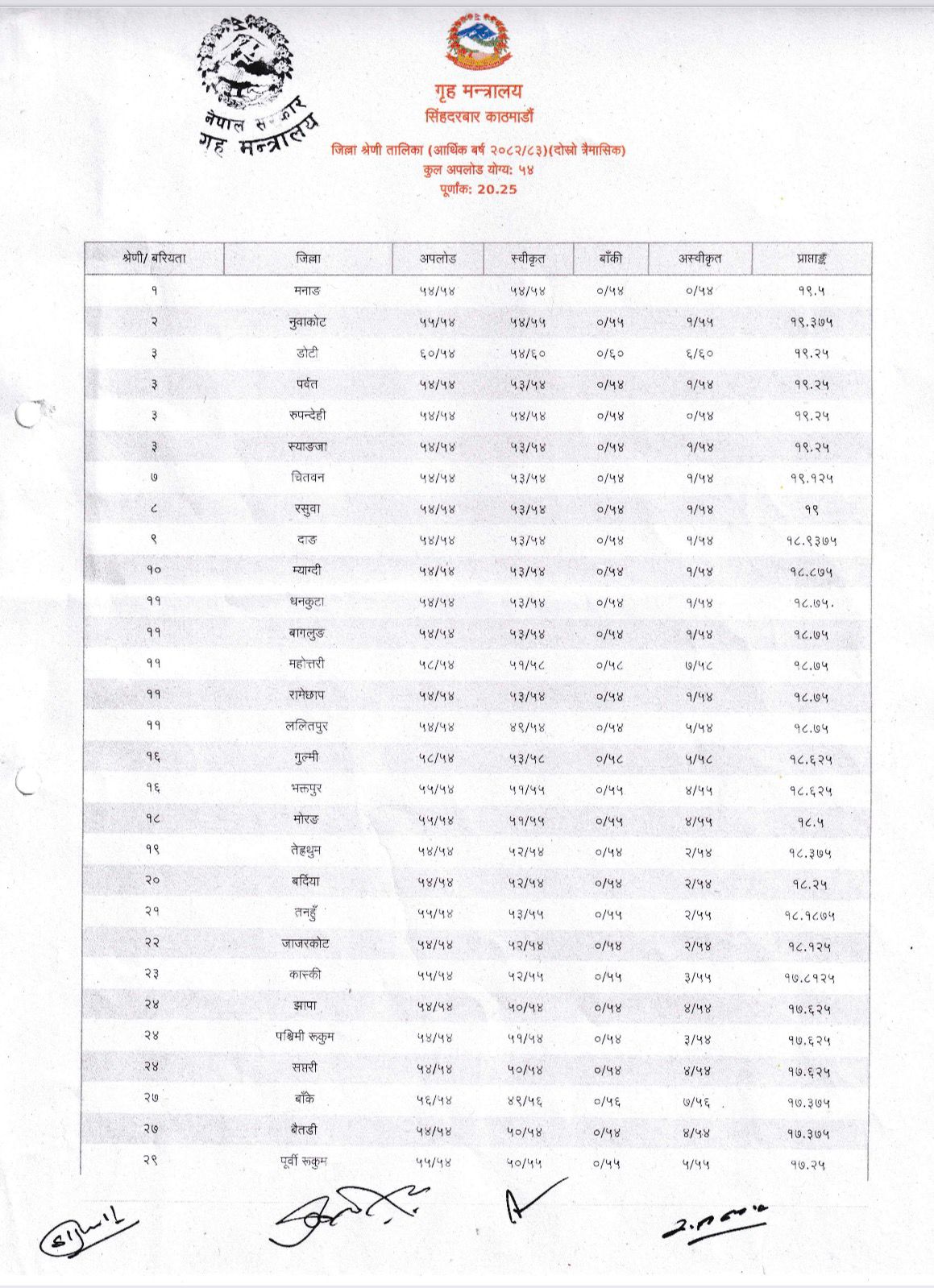 गत कात्तिक, मंसिर र पुसको दोस्रो त्रैमासिक कार्यसम्पादन मूल्याङ्कनमा २०.२५ पूर्णाङ्कमा ७७ जिल्लामध्ये सबैभन्दा धेरै अङ्क १९.५ ल्याएको हो । मनाङमा प्रमुख जिल्ला अधिकारी उपसचिव नवराज पौड्याल छन् ।