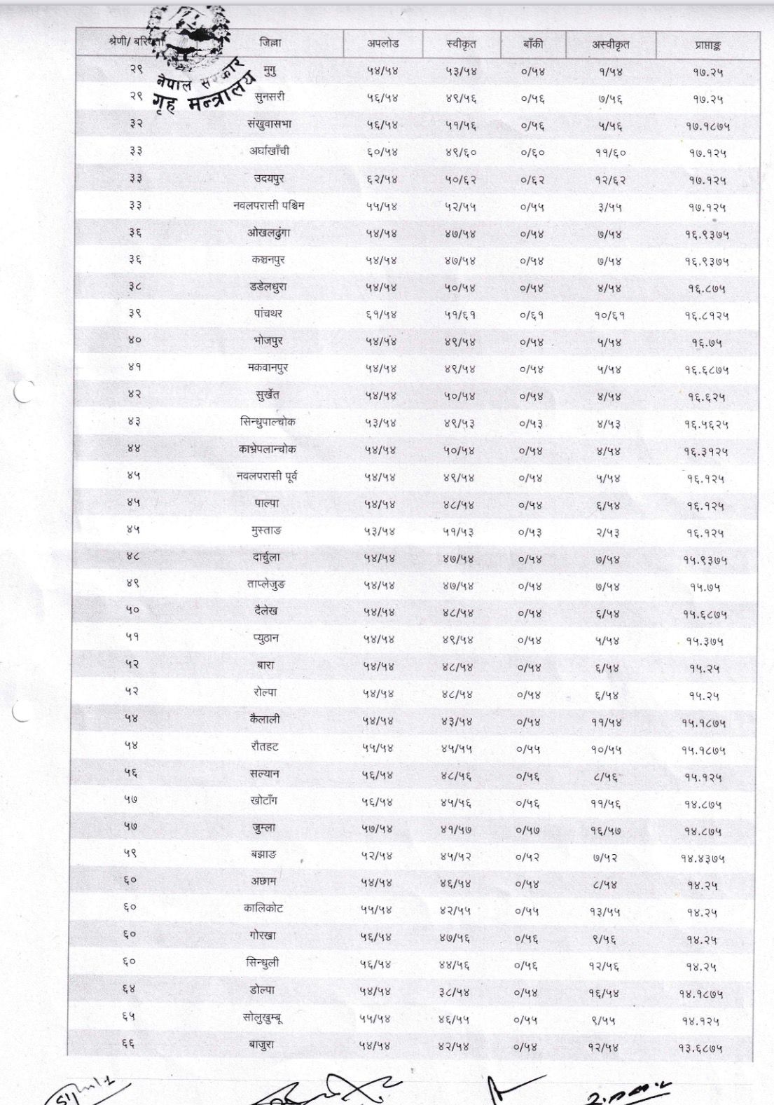 मूल्याङ्कनमा लमजुङ जिल्ला ७३ स्थानमा छ । लमजुङले त्यही पूर्णाङ्कमा कम ११.३७५ अङ्क मात्रै ल्याउन सकेको छ । लमजुङका प्रमुख जिल्ला अधिकारीका रूपमा सहसचिव कृष्ण प्रसाद खनाल कार्यरत छन् ।