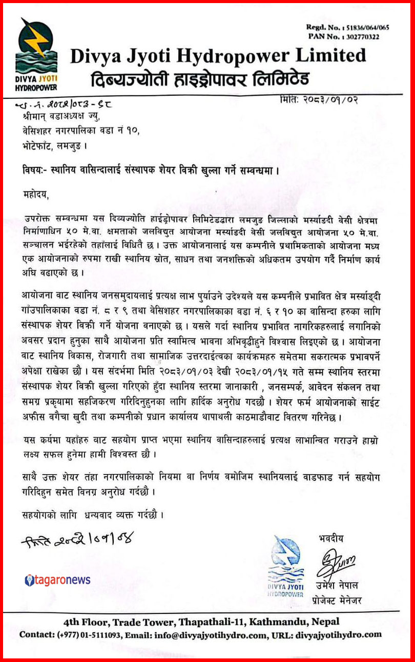 दिव्यज्योति जलविद्युत् कम्पनीद्धारा निर्माण थालिएको यस आयोजनामा स्थानीय बासिन्दाका लागि संस्थापक सेयर बिक्री खुला गरिएको हो ।
