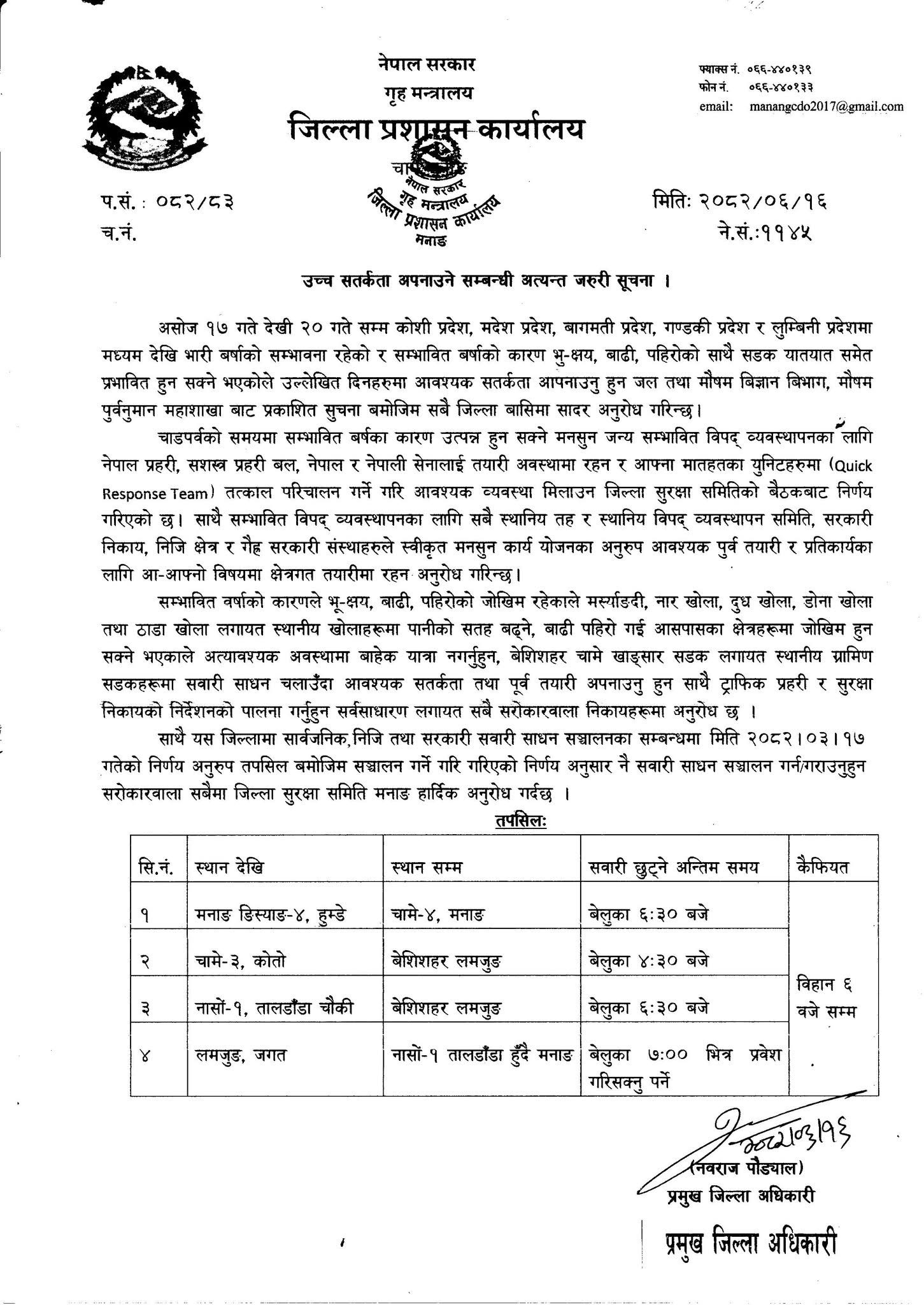 मनाङबाट लमजुङ सदरमुकाम बेसीशहरसम्मको लागि मनाङ सिमानाबाट बेलुकी साढे ६ बजेसम्म र लमजुङबाट मनाङतर्फ बेलुकी ७ बजेसम्म सवारी छुटिसक्नुपर्ने गरी जिल्ला सुरक्षा समितिले निर्णय गरेको छ ।