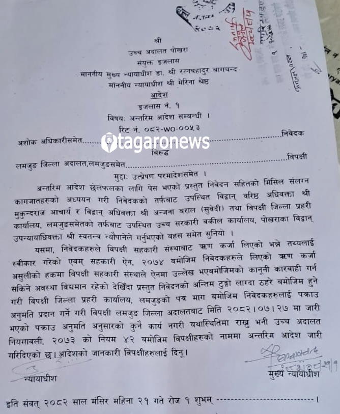 उच्च अदालत पोखराका मुख्य न्यायाधीश डा. रत्नबहादुर बागचन्द र न्यायाधीश मेरिना श्रेष्ठको मंसिर २१ गतेको संयुक्त इजलासले यस्तो आदेश दिएको हो ।