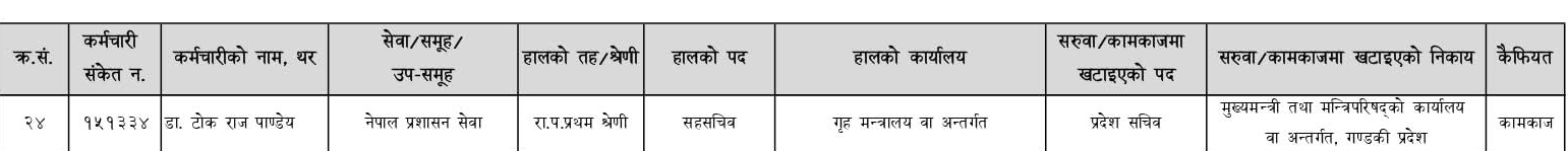 बिहीबार बसेको मन्त्रिपरिषद् बैठकले प्रजिअ पाण्डेलाई गण्डकी प्रदेश मुख्यमन्त्री तथा मन्त्रिपरिषद् कार्यालयमा सरुवा गरेको हो ।